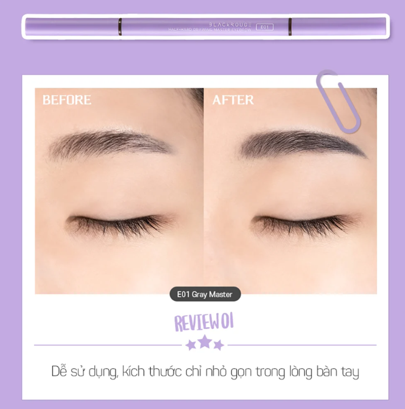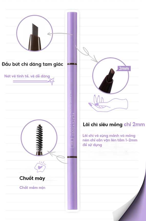 Màu chì E01 hơi xám đen cực kỳ phù hợp với đặc tính của người châu Á nói chung và Việt Nam nói riêng (kiểu người da vàng, tóc đen, dài). Chì kẻ mày Black Rouge thiết kế cực kỳ nhỏ gọn, tiện lợi với 2 đầu là cọ và chì giúp bạn có thể định hình dáng lông mày nhanh, không tốn quá nhiều thời gian. Đầu chì siêu mảnh là ưu điểm để bạn có thể kẻ lông mày theo kiểu tô hoặc gẩy sợi mảnh.