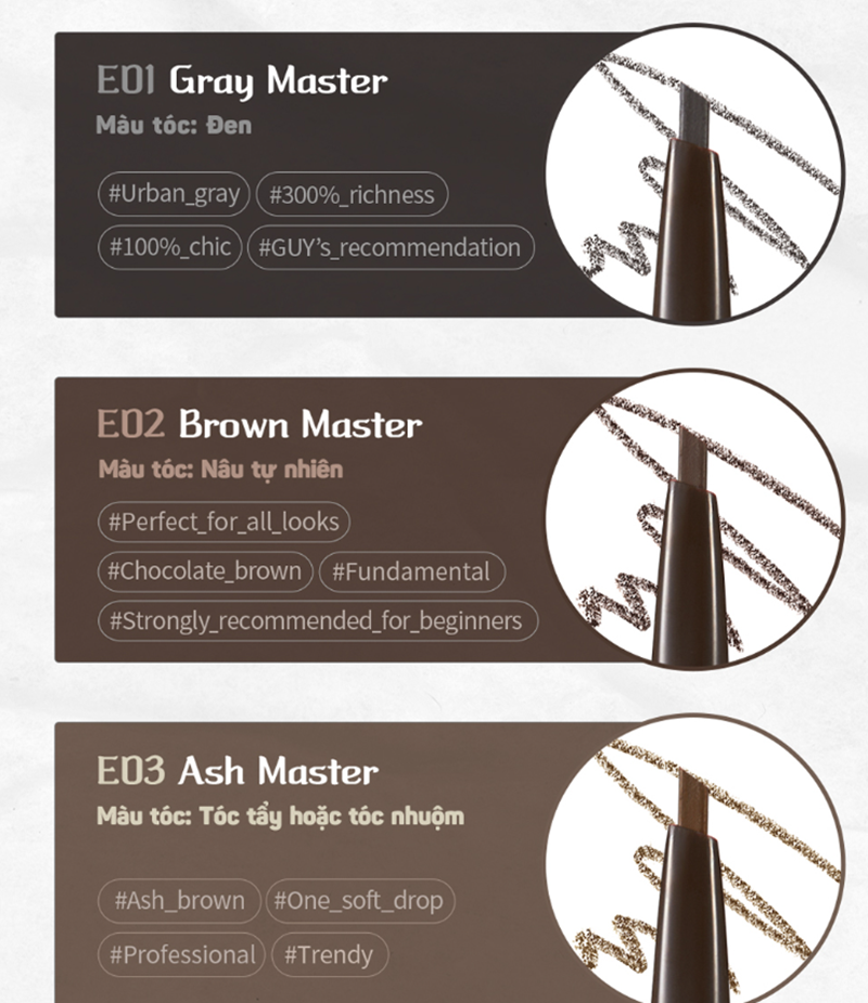 Chì kẻ mày là sản phẩm không thể thiếu của chị em khi đi ra ngoài. Bộ sưu tập chì kẻ mày Half - Hard Drawing Master Eyebrow Black Rouge gồm 3 màu cơ bản là Gray Master, Brown Master và Ash Master - màu chì kẻ mắt thông dụng và có tính ứng dụng cao nhất trong thị trường sắc đẹp hiện nay.