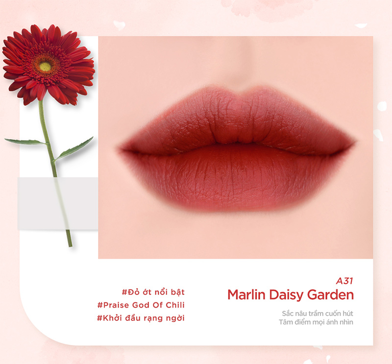 Son Black Rouge Airfit Velvet A31 có tên gọi là Dry Daisy Garden, là một màu đỏ nâu trầm classic pha một chút ánh cam mang hơi hướng hơi cổ điển. Màu son này sẽ phù hợp với hầu hết các làn da và các tone make up khác nhau. Trong son sẽ chứa một chút sắc vàng nhưng được kết hợp với màu nâu đậm mang nên không làm xỉn men răng hay khiến da tối đi.