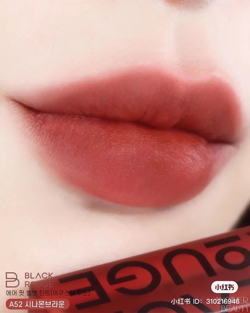 Black Rouge Airfit Velvet A52 là thỏi son cuối cùng của bộ sưu tập trên với màu chủ đạo là nâu quế. Đây là gam màu trầm được pha giữa sắc đỏ và nâu tạo cảm giác thanh lịch cho người sử dụng. A52 là sản phẩm rất được bán chạy vào mùa thu bởi mang lại cảm giác ấm áp và gần gũi. Chúng được đánh giá khá phù hợp với các kiểu makeup nhẹ nhàng nhằm tôn lên vẻ đẹp tự nhiên của người phụ nữ.