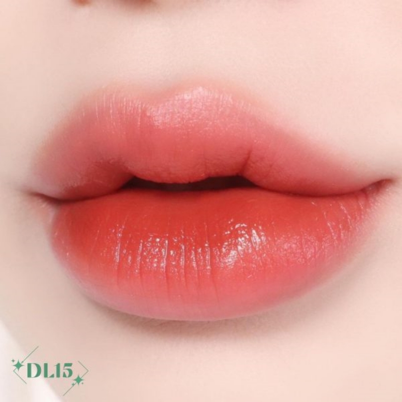 Màu son DL15 là một tone đỏ cam có pha ánh nâu nhưng thiên về sắc cam trẻ trung không kén màu da, lớp tint son ánh cam nên giúp nàng che khuyết điểm thâm viền môi hiệu quả khiến nhan sắc thăng hạng vượt bậc.